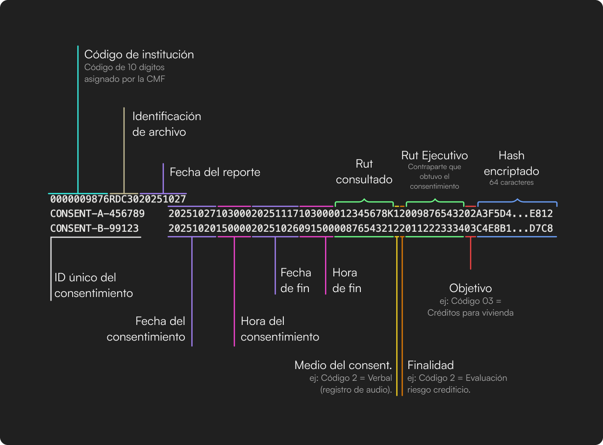 - Líneas siguientes: Cada acción de consentimiento en formato de ancho fijo
